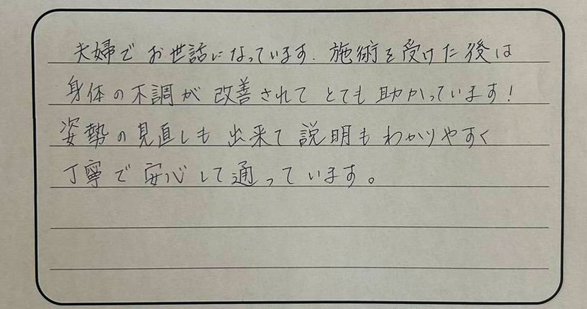 夫婦でお世話になっています。施術を受けた後は身体の不調が改善されとても助かっています!